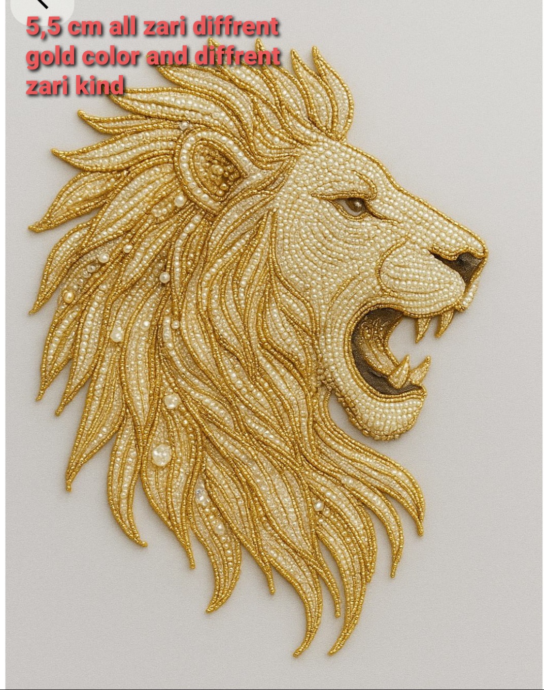 The lion’s face features a dense, basket-weave zari pattern that provides a textured, matte finish, contrasting beautifully with the high-shine bullion used for the mane. The eyes and roaring mouth, complete with visible teeth and a tusk-like element, are rendered with meticulous precision. Entirely bead-and-pearl free, this patch relies solely on advanced thread work and metallic layering for its premium appearance. Crafted on a clean fabric base with a neat bullion border, this lightweight yet durable patch is perfect for high-end fashion, ceremonial attire, and premium accessories.
