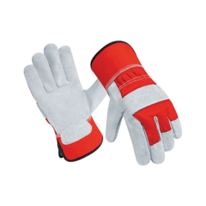 Durable work gloves made from split cowhide leather with a breathable red fabric back. Designed with a reinforced palm and fingers for added protection and a rubberized safety cuff for wrist safety and easy wear. Ideal for construction, farming, material handling, and general labor.