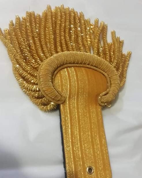 Elevate ceremonial uniforms or theatrical costumes with this exquisite Gold Bullion Epaulette. This shoulder piece is designed with traditional military precision, featuring a striking combination of textured finishes and classic fringing.