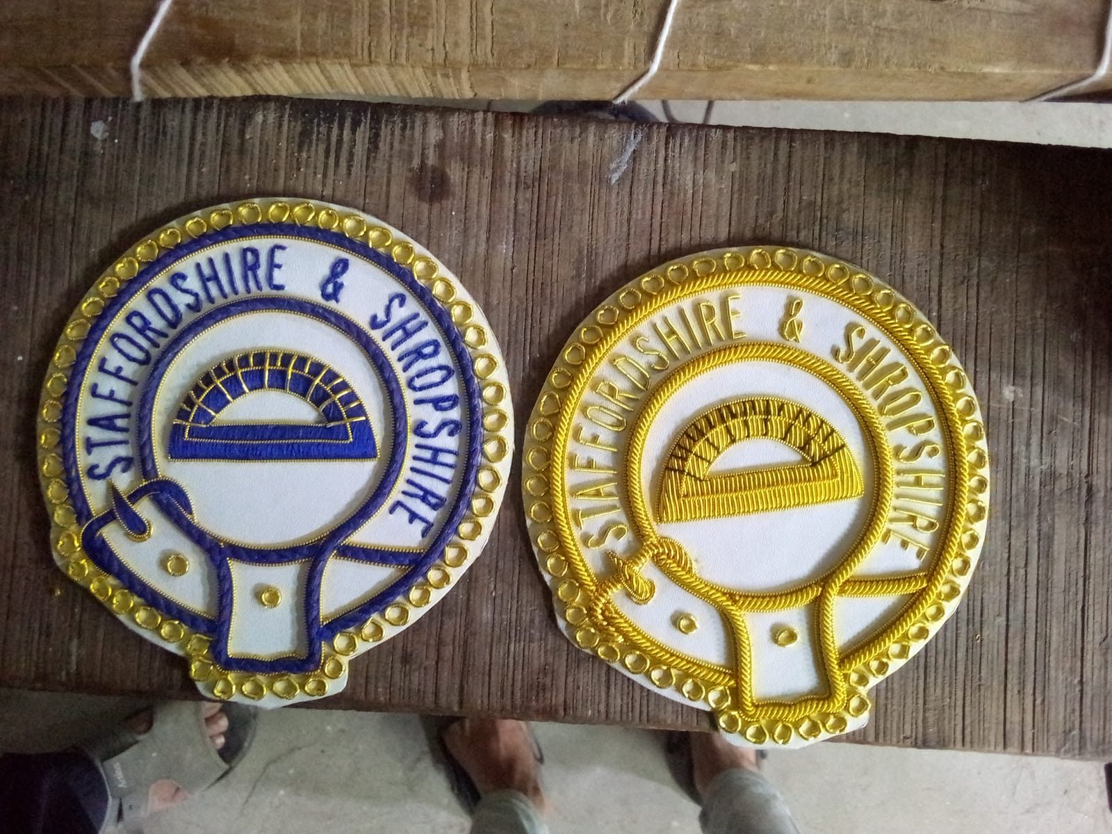 • Precision: Fine-detail embroidery using genuine gold bullion wire on a circular black background.